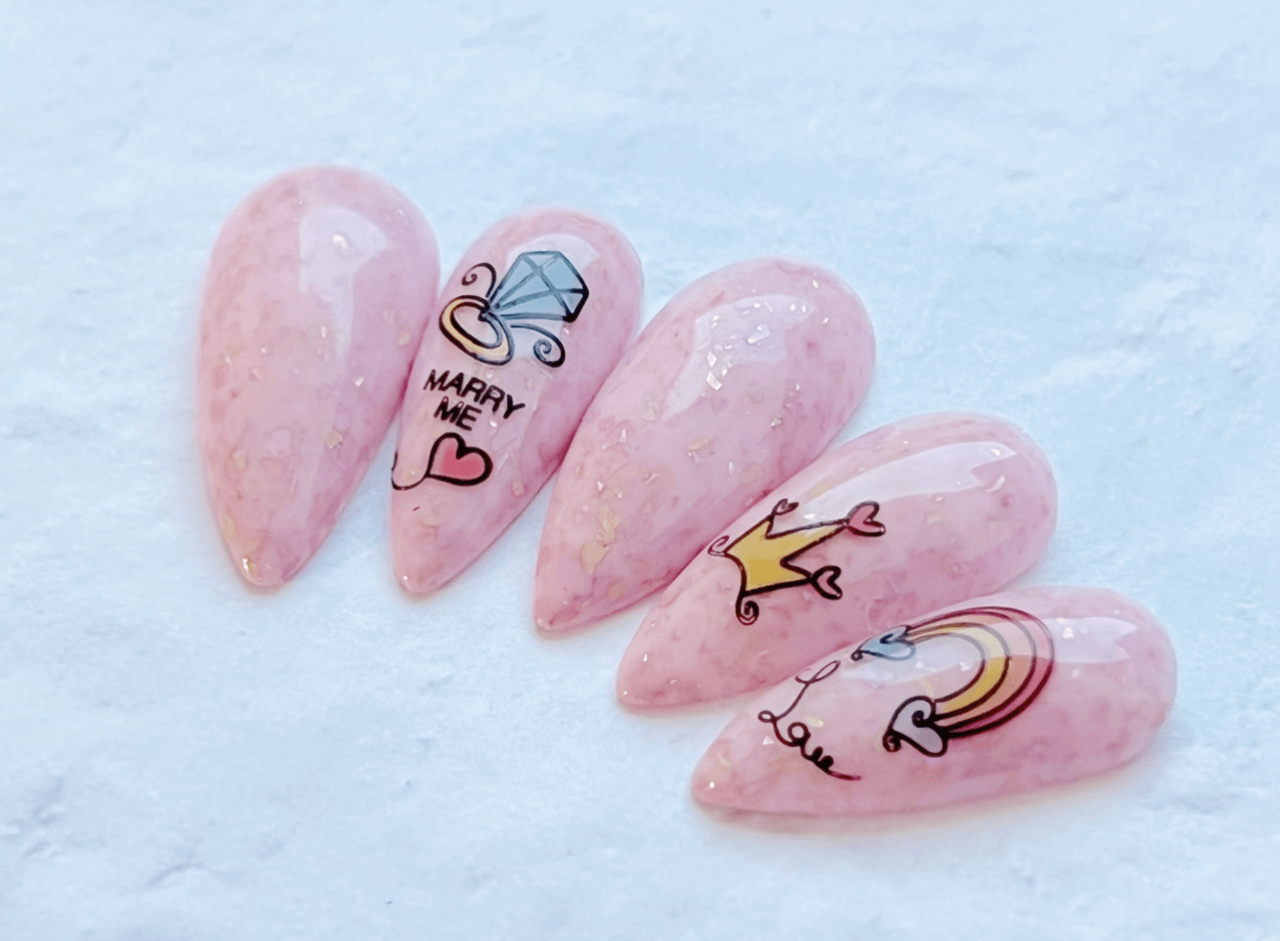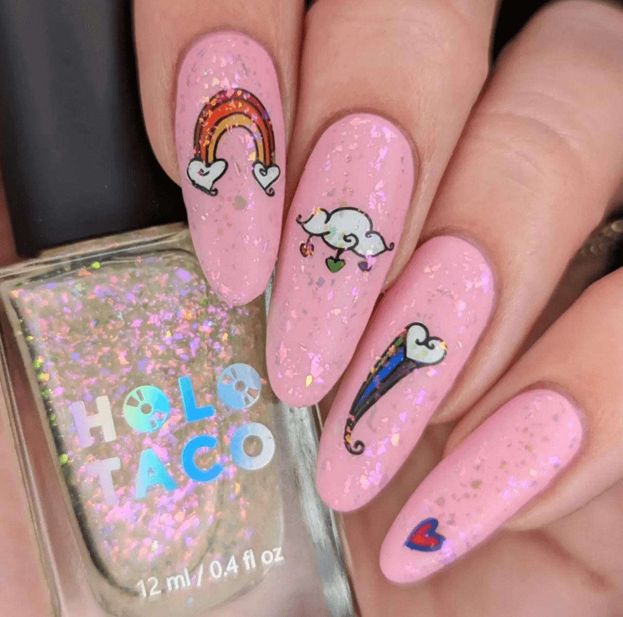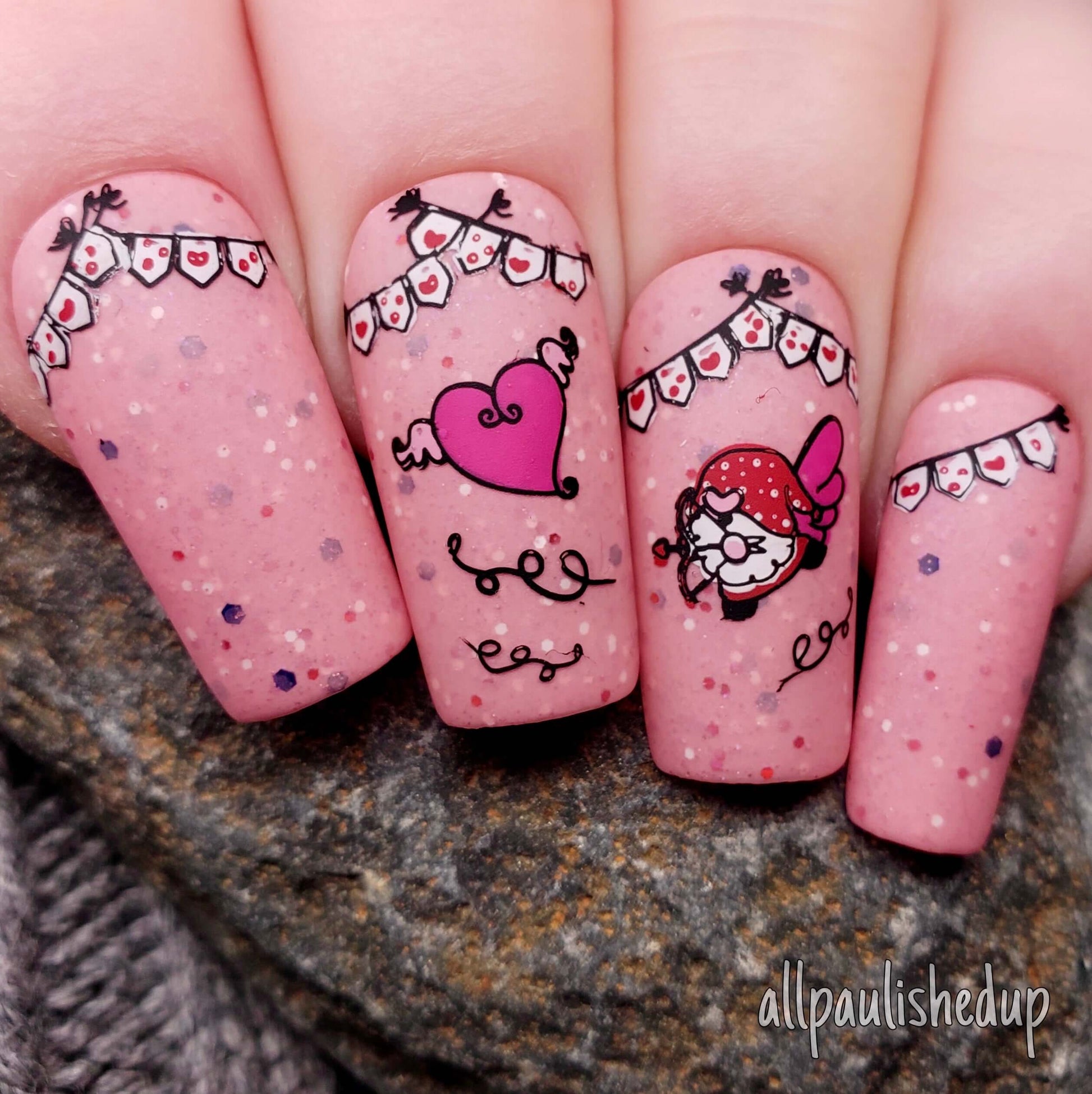 There are cute hand-drawn style hearts, bows, crowns, flowers, love birds, and Valentine gnomes!  Or the classic Valentine's candy, love hearts to make your mani a little sweeter still.