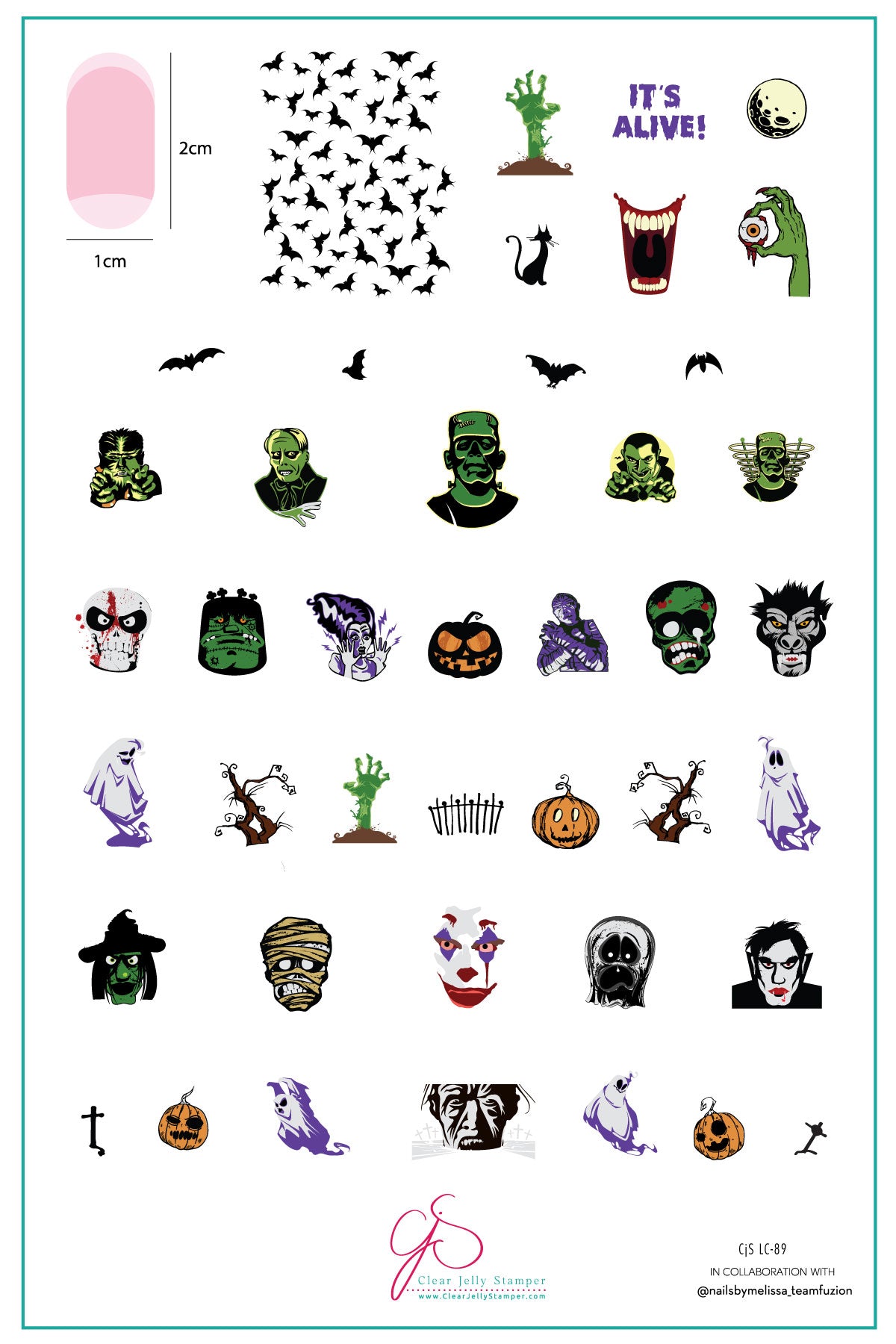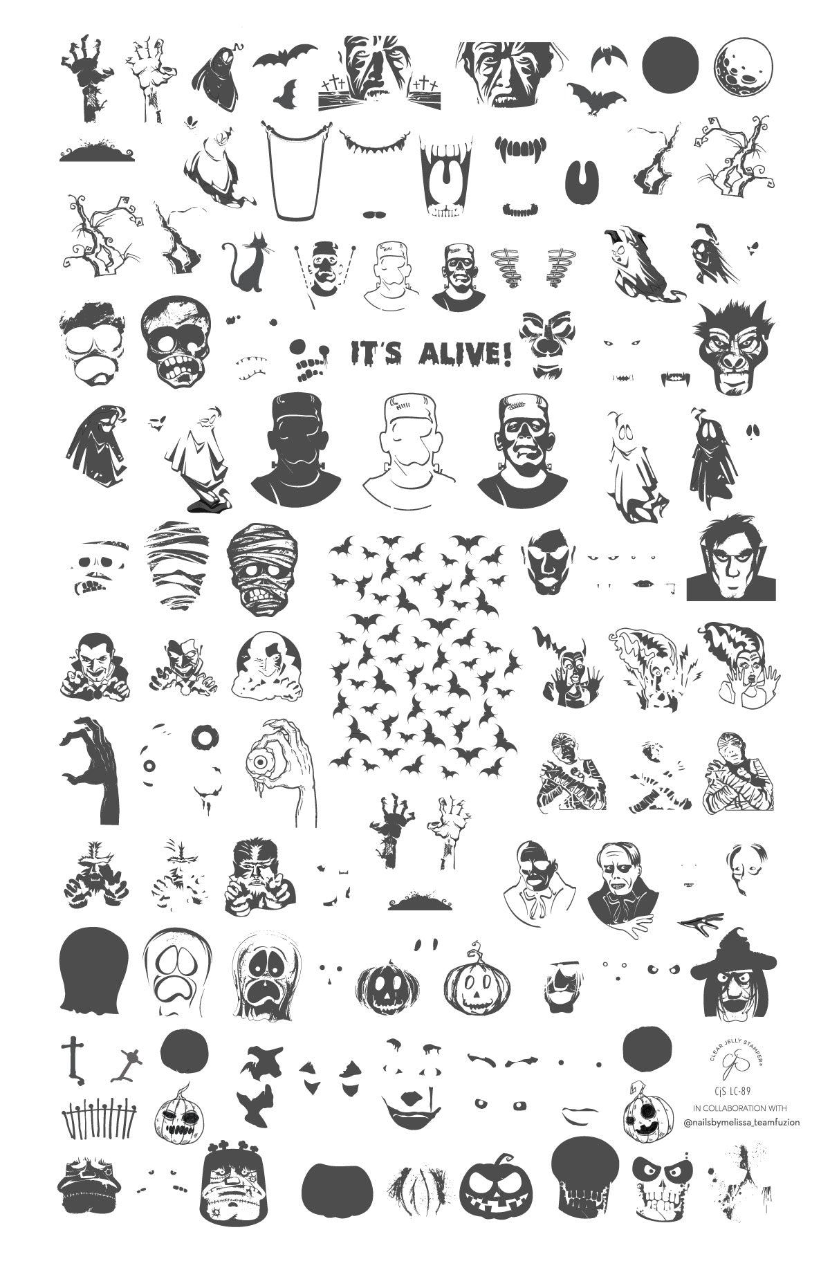 Ready for some creepy nail art? It's Alive! (CjSLC-89) Steel Nail Art Layered Stamping Plate brings you all the frightful fun with pumpkins, bats, eyeballs, creepy hands, clowns, mummies, ghosts, skeletons, werewolves, crosses, trees, witches, Frankenstein, fangs, and Count Dracula! This is the perfect plate for a spooky mani that'll leave 'em shivering in fear!