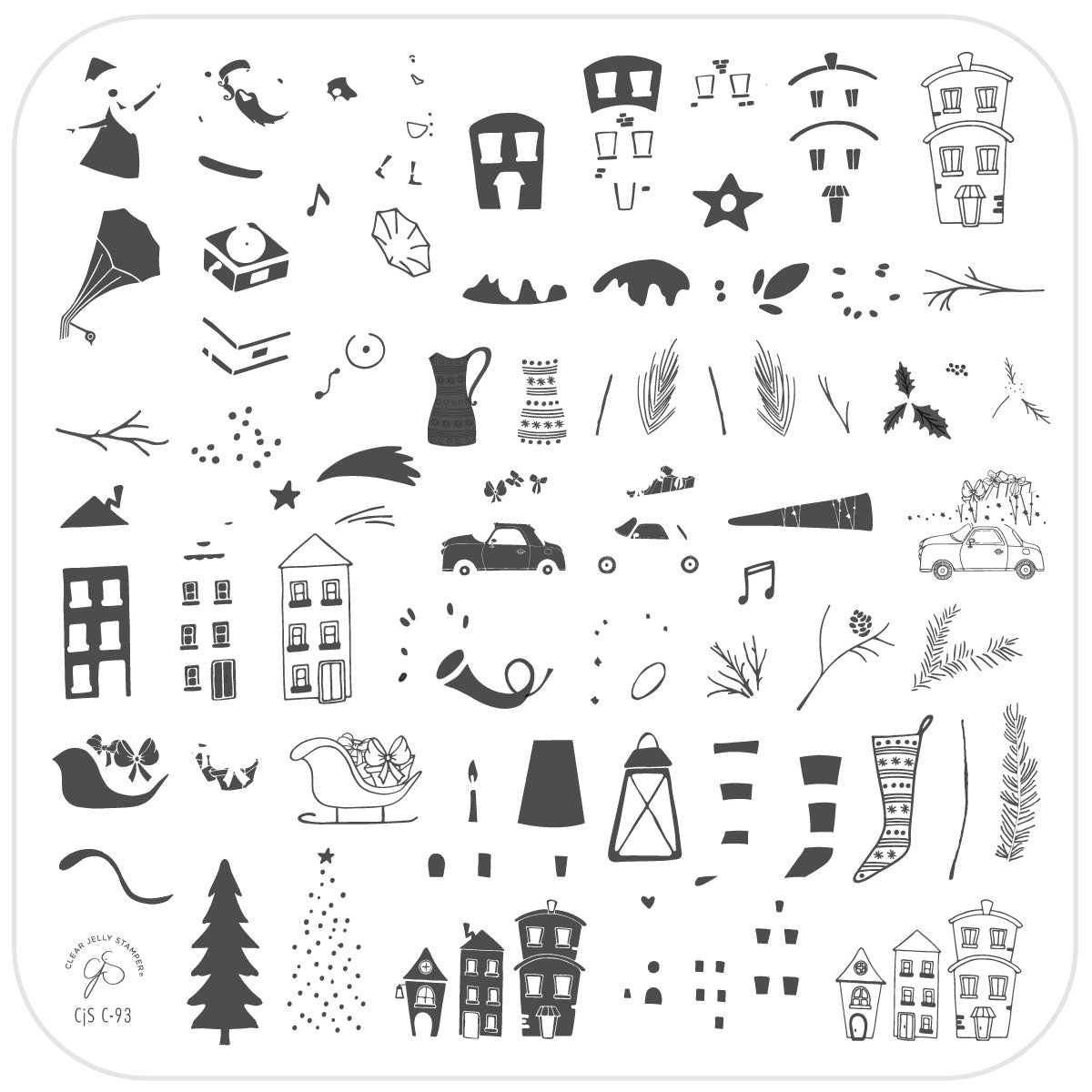Step back in time this holiday season with the CJS C-93 Retro Festive Christmas nail art stamping plate! This 8x8 plate is filled with charming, vintage-inspired designs, perfect for a nostalgic Christmas vibe. Capture scenes of cozy houses, a classic car carrying a Christmas tree, and delightful retro icons that bring the warmth and cheer of Christmases past to your nail art. Whether you're creating a whimsical winter wonderland or celebrating in retro style, this plate adds a timeless, festive touch to your holiday nails!