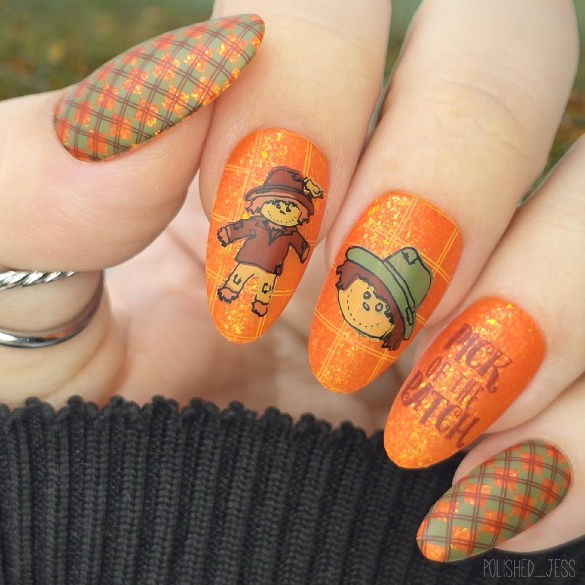 When the crisp air starts to take over from the heat and the sun starts to take on that golden autumn glow... who doesn't think of the scarecrows that have been bravely guarding the fall harvests? This gorgeous plate was a collaborative effort with our friend Carlea @NaturallyVogueNails!