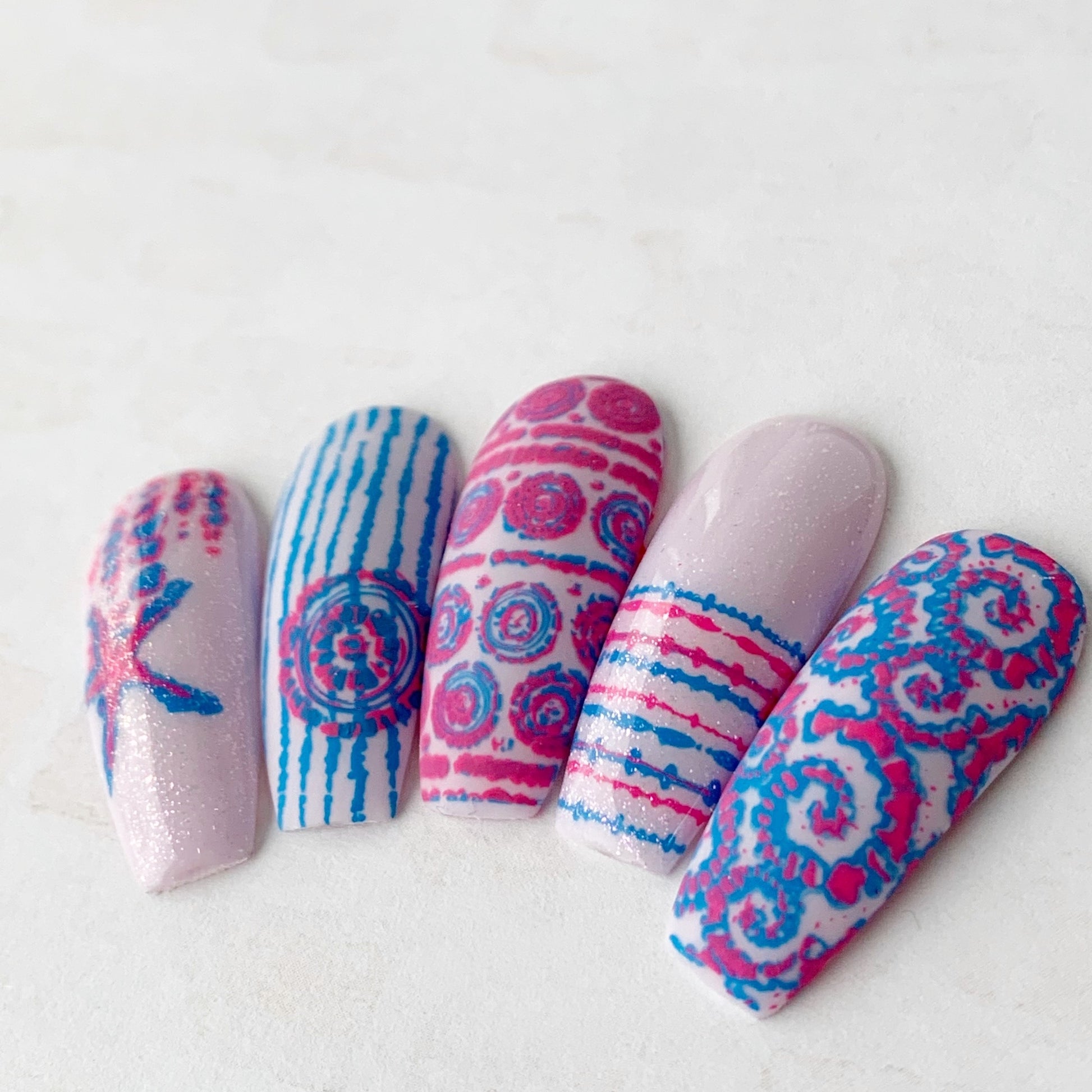 Have you ever heard of Shibori? It is a Japanese tie-dyeing technique! Done manually, it produces a number of different, stunning patterns on fabric. So... let's layer them onto your next mani!